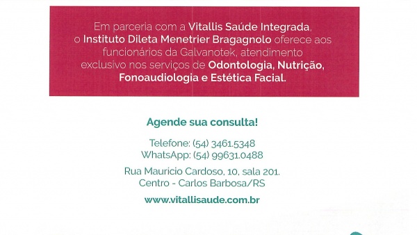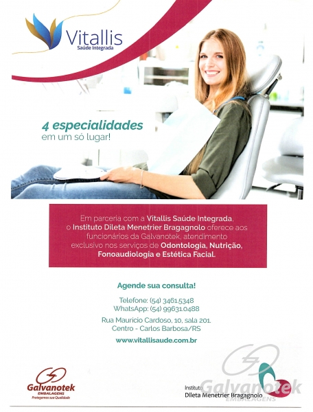 Março inicia com novidade: agora os funcionários da Galvanotek Embalagens contam com mais uma parceria: Vitallis Saúde Integrada, com 4 especialidades em um só lugar: Odontologia, Nutrição, Fonoaudiologia e Estética Facial.